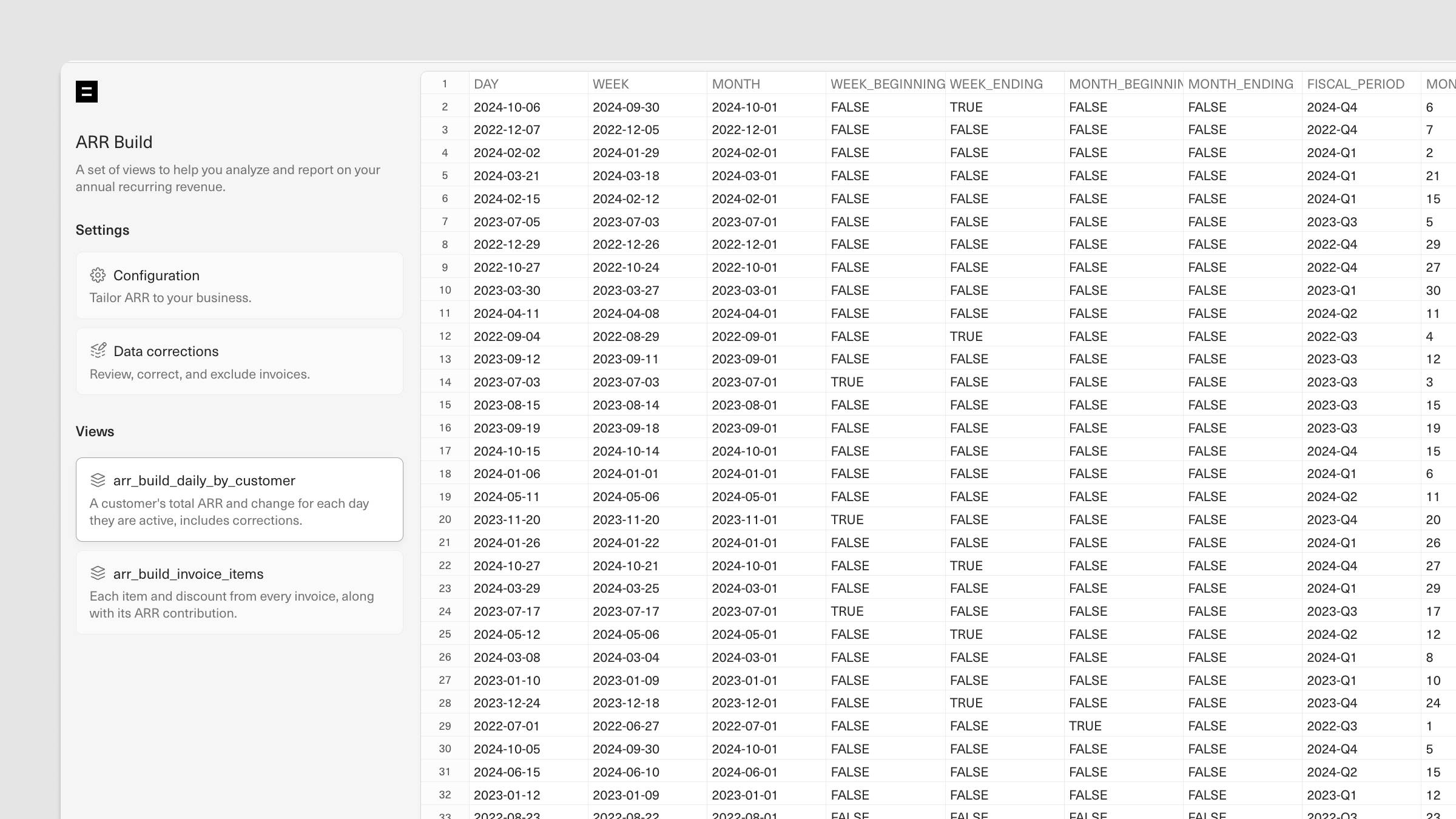 The ARR Build Daily by Customer view is the foundation of your ARR reporting, enabling you to build downstream reports like:- Cohort analyses that measure net and gross retention rates