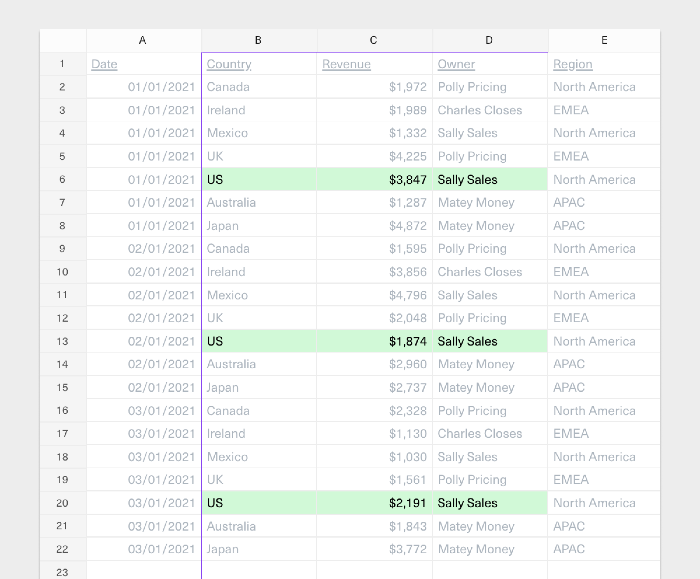 Using a sample of our country revenue data introduced in the previous section, let’s imagine we want to calculate the total revenue owned by Sally Sales, the VP of Sales.