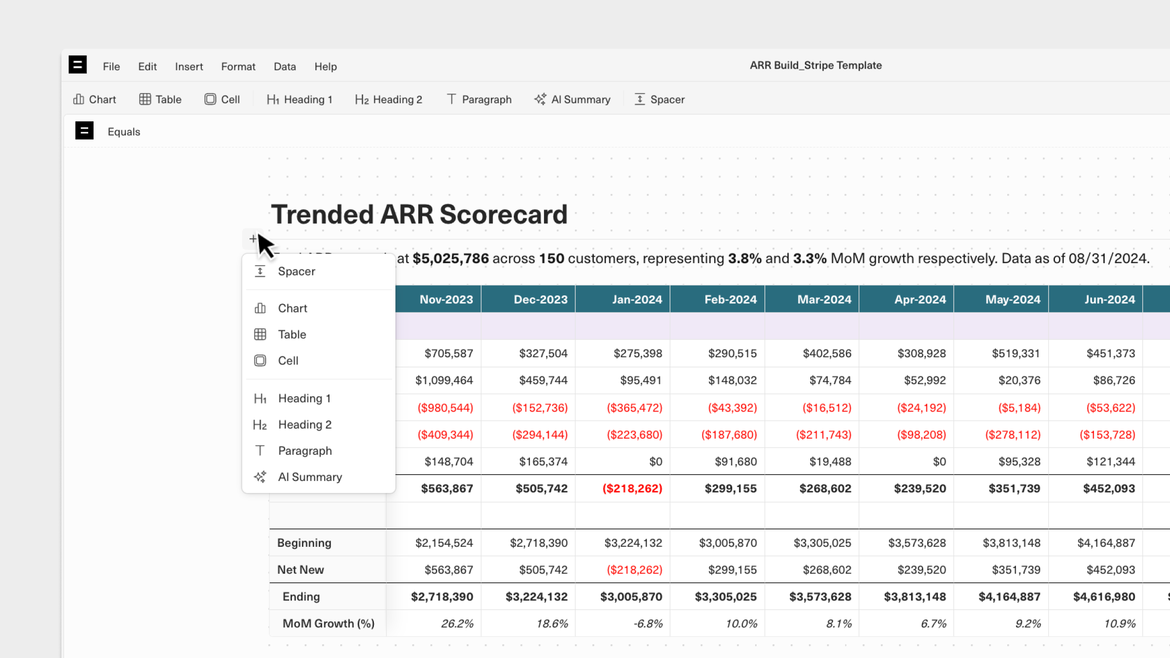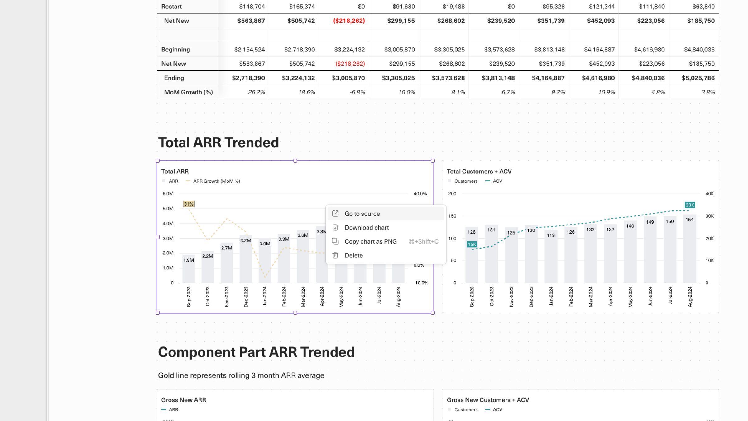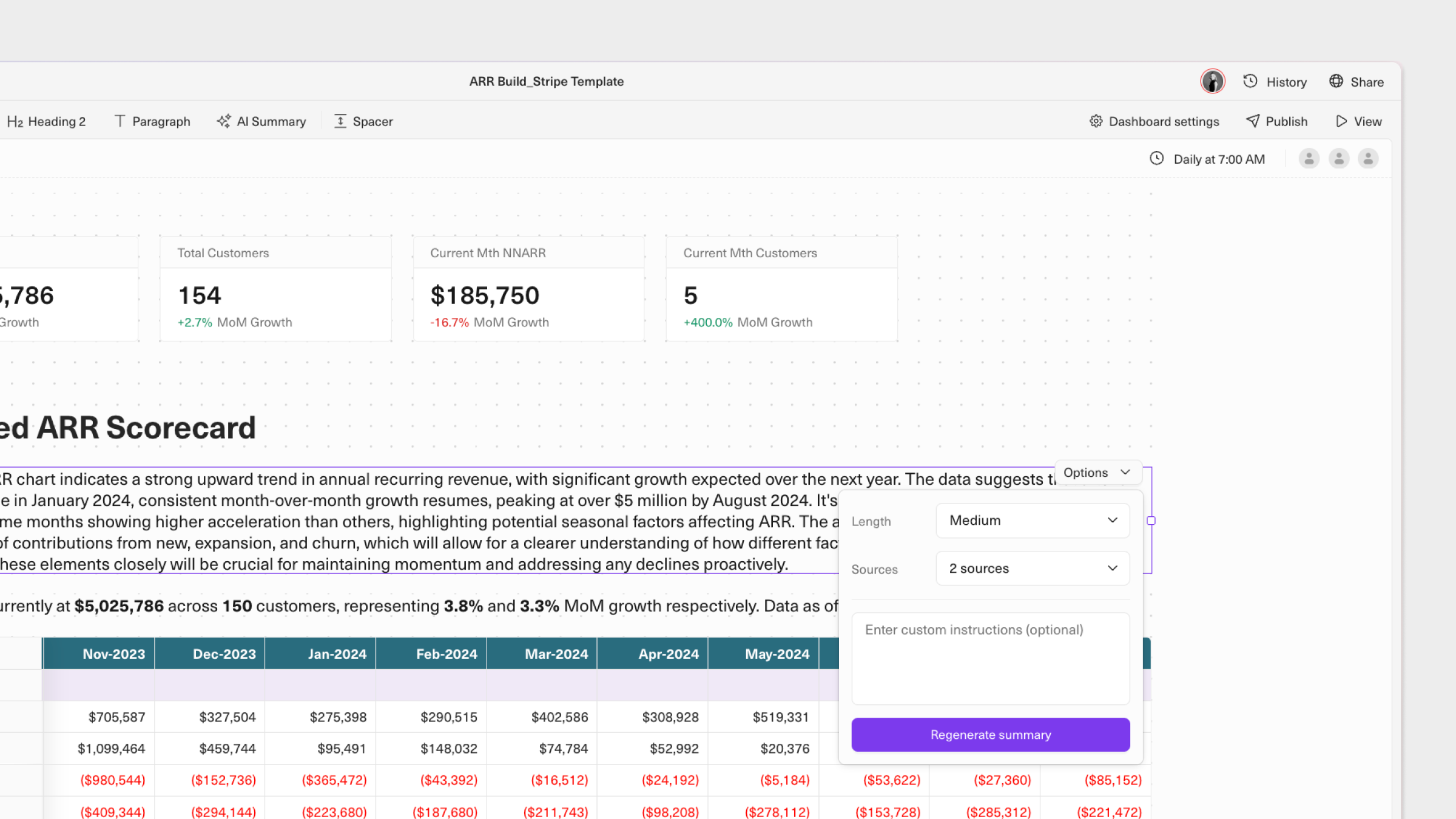 Charts, tables, and cells will automatically refresh when the underlying data is updated–either manually or automatically via a query. AI Summaries will automatically regenrate when the data in selected charts and tables are updated. They can also be manually re-generated via theirOptions menu.Charts