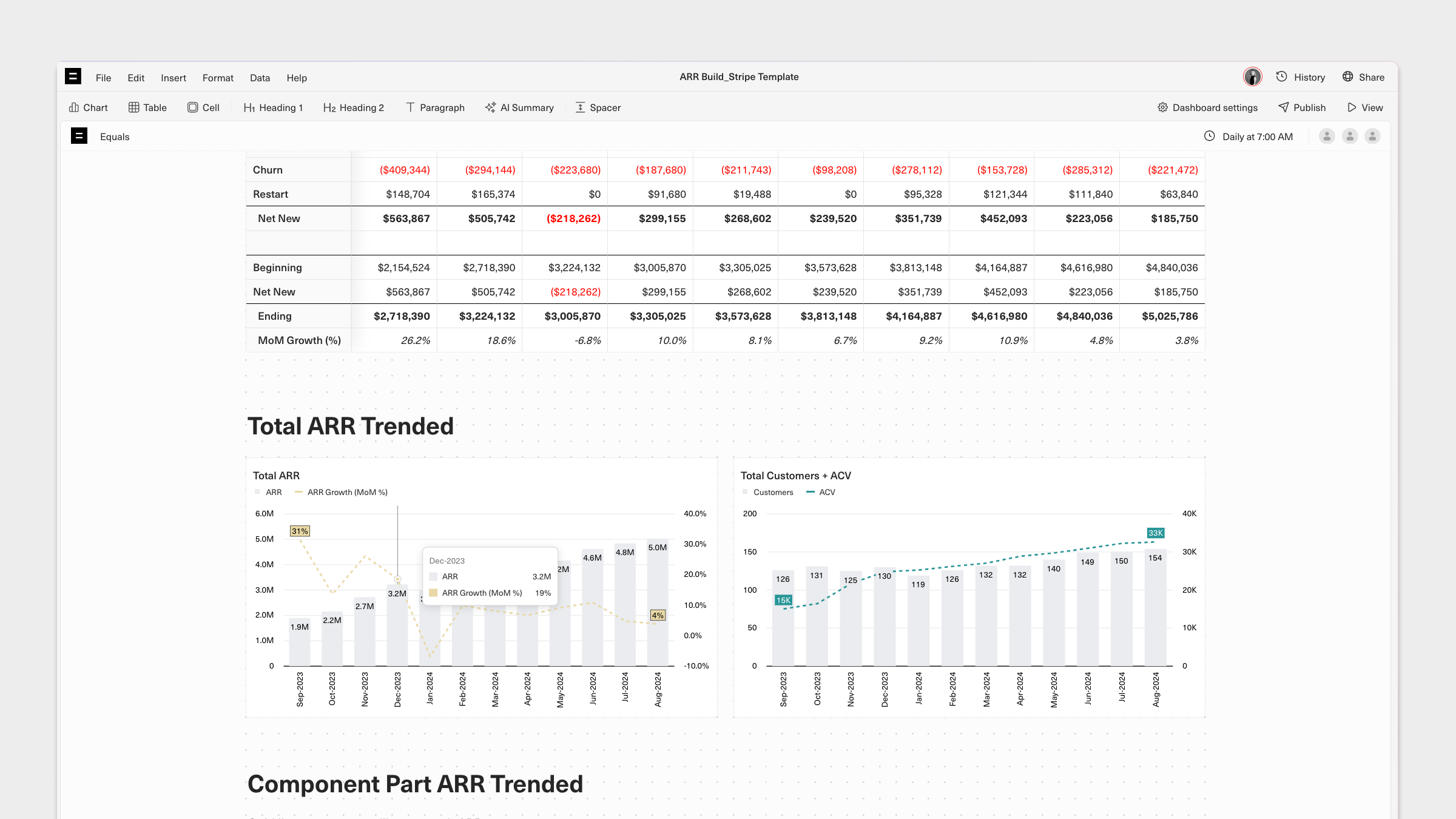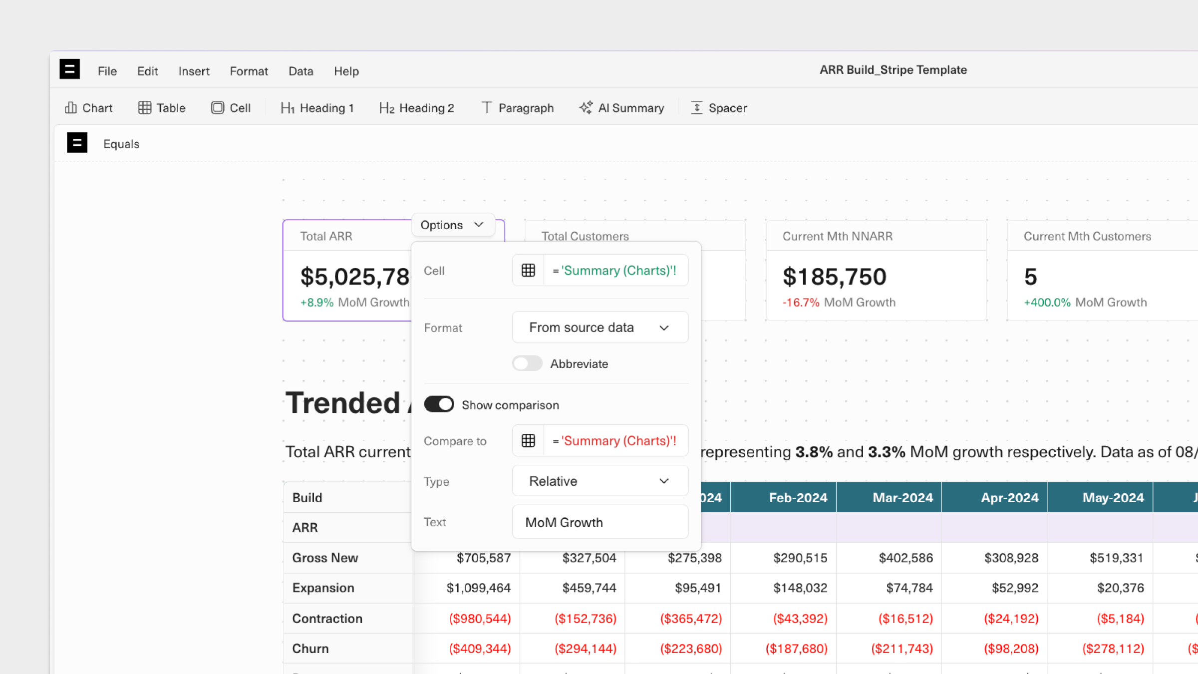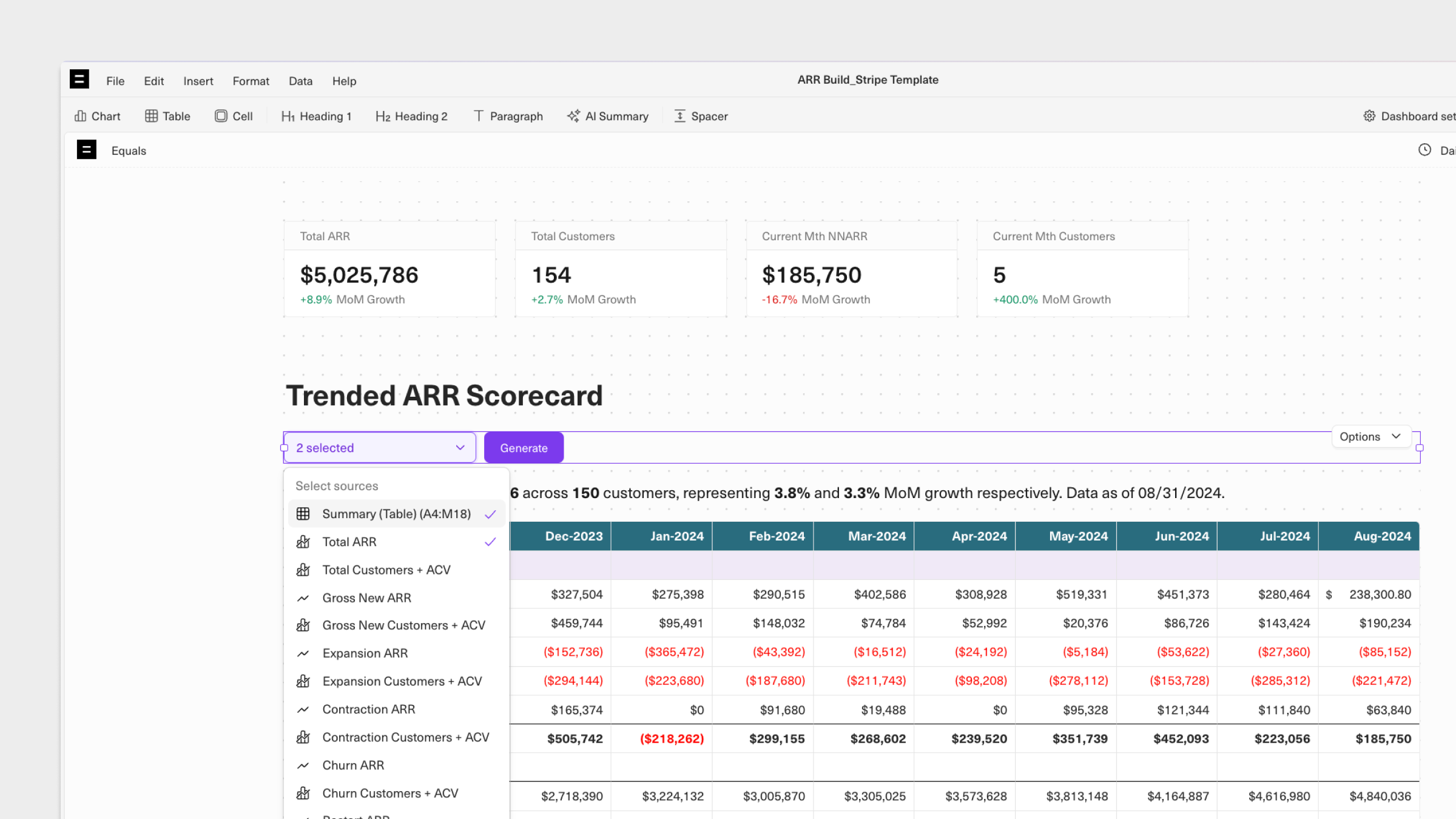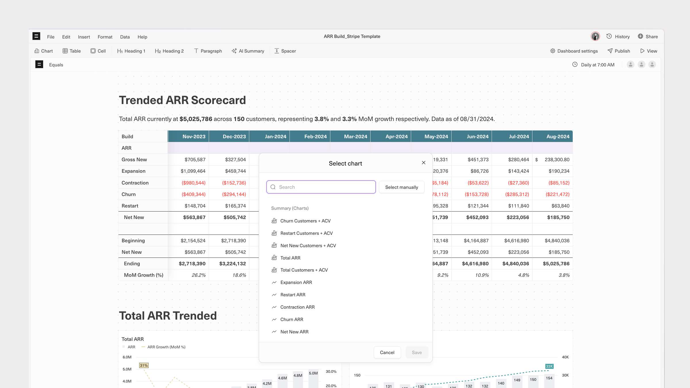 Charts, tables, and cells will automatically refresh when the underlying data is updated–either manually or automatically via a query. AI Summaries will automatically regenrate when the data in selected charts and tables are updated. They can also be manually re-generated via theirOptions menu.Charts