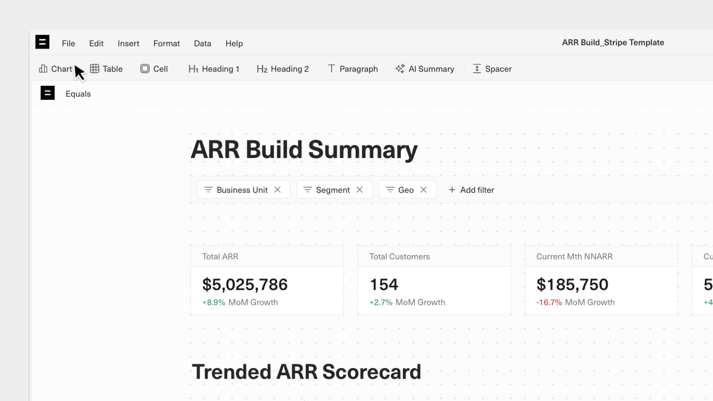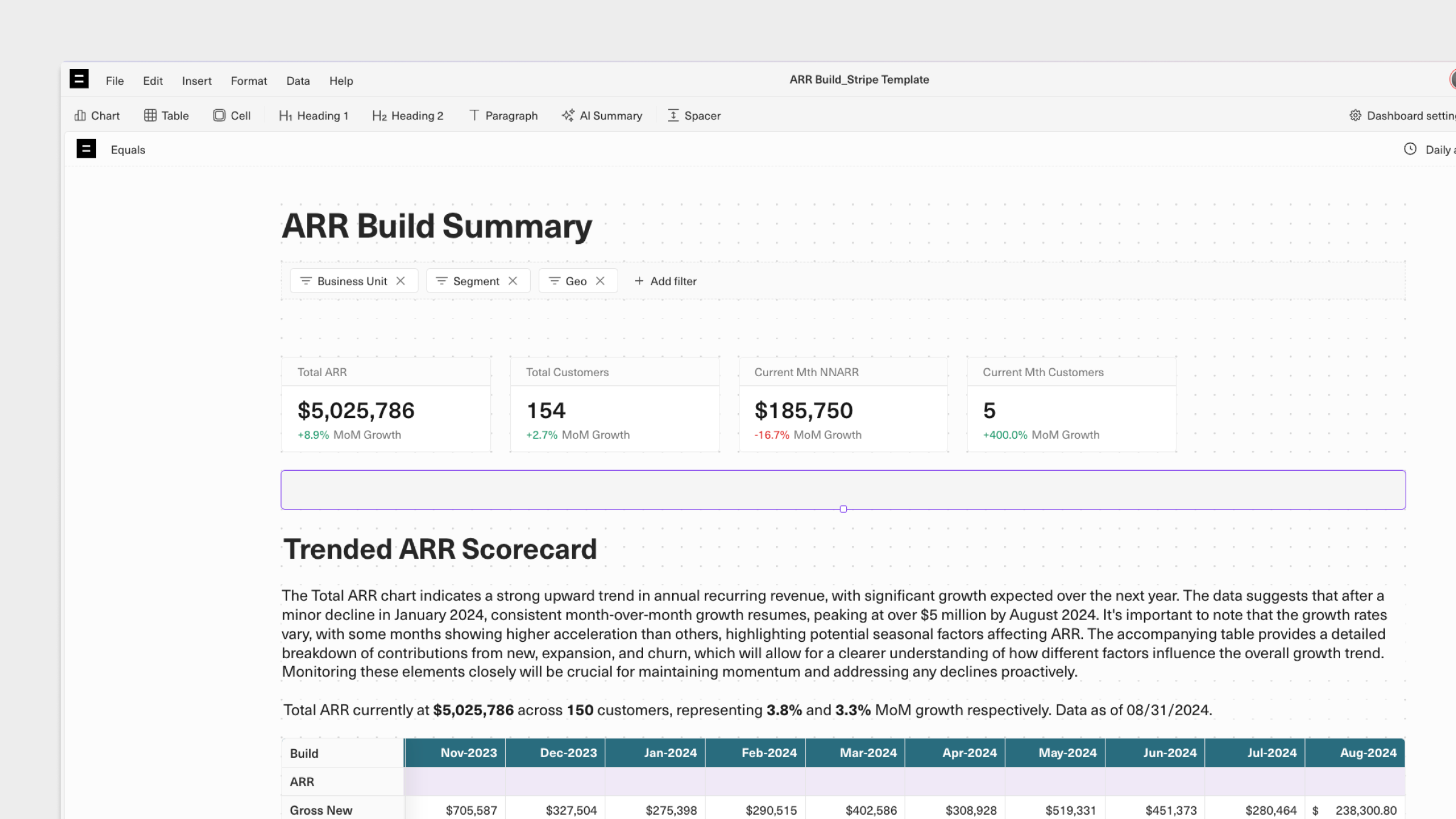 Dashboard tab in the bottom-left of your Equals workbook. You can add any chart, table (range of cells), or individual cell in your workbook to your dashboard. You can also add text headings, paragraphs, and auto-generated AI Summaries of selected tables and charts.