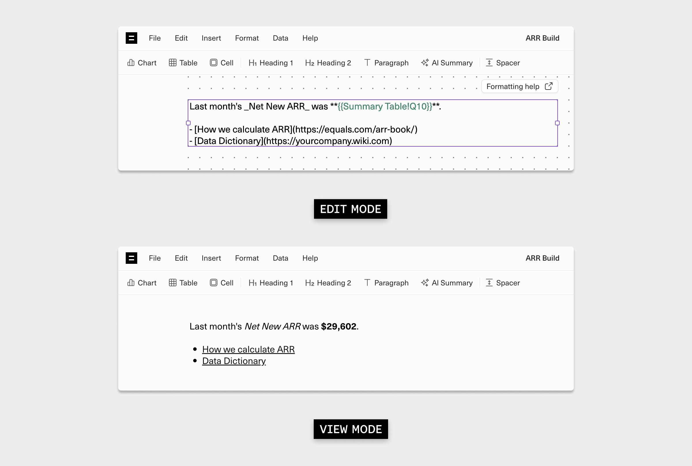 Text headings (H1 and H2) and paragraphs can be added anywhere on a dashboard. Paragraph text can be formatted using Markdown, and cells in the workbook can be referenced in both paragraphs and headings.