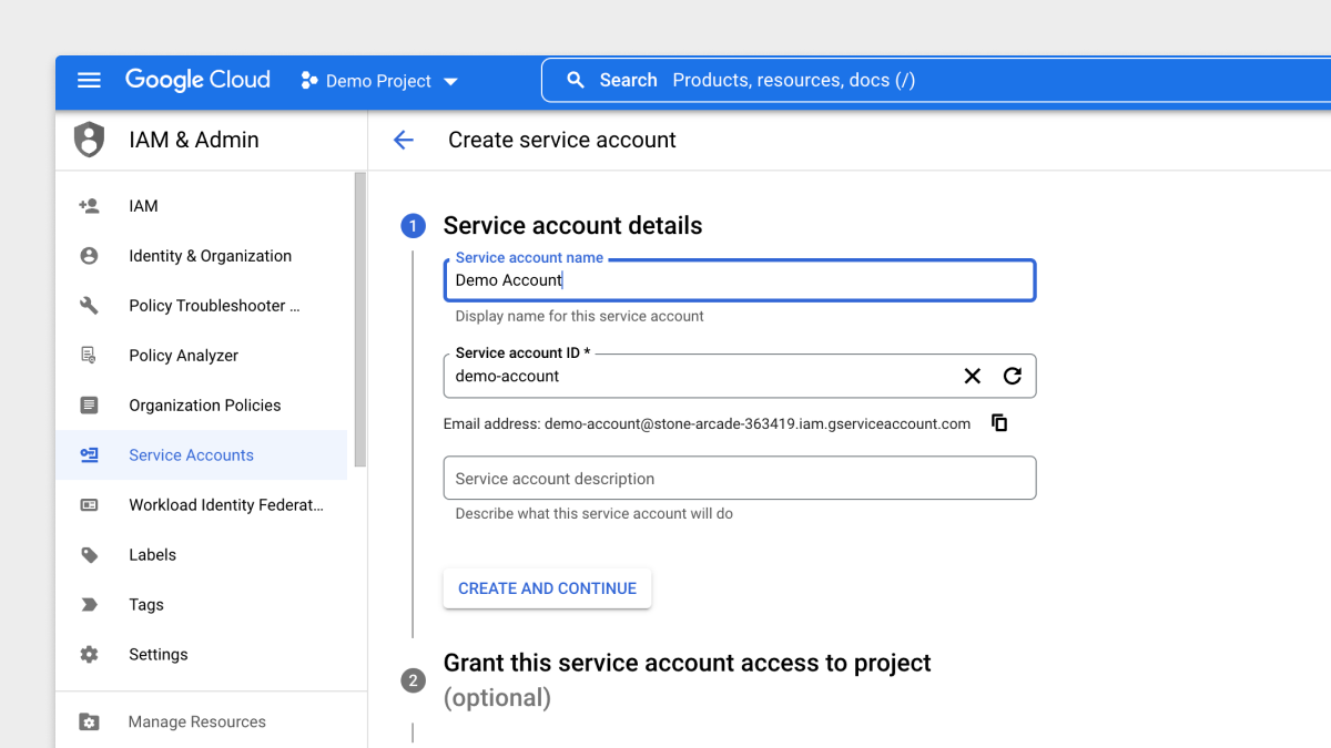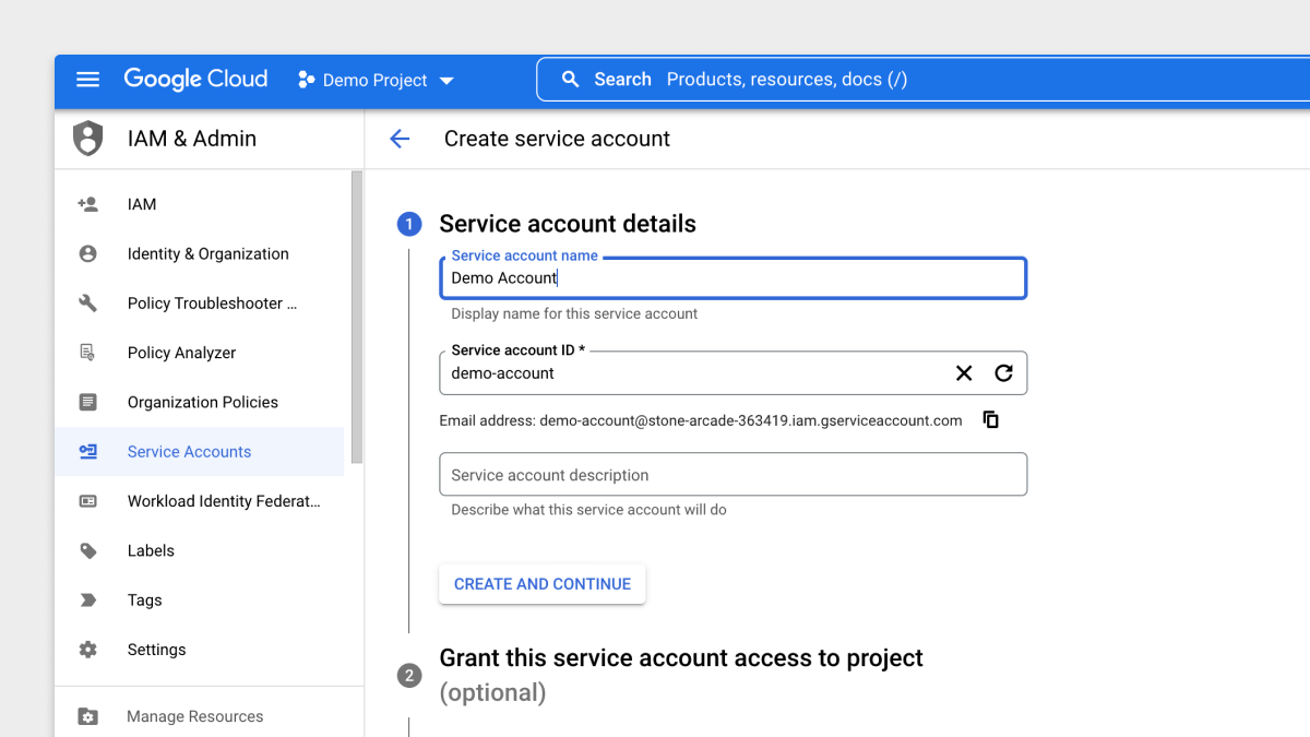 Start by going to this page and select the project you’d like to connect to. Once you select the project, enable the Google Analytics API by clicking Next and then Enable. Then you’ll need to create a service account. To do so, you’ll need to click on the menu in the left hand corner and navigate to APIs and Services > Credentials. On this screen, select Manage Service Accounts in the bottom left hand corner. Then select Create Service Account. Here you can give your account a name and click Create and Continue. You can continue through the two optional fields.