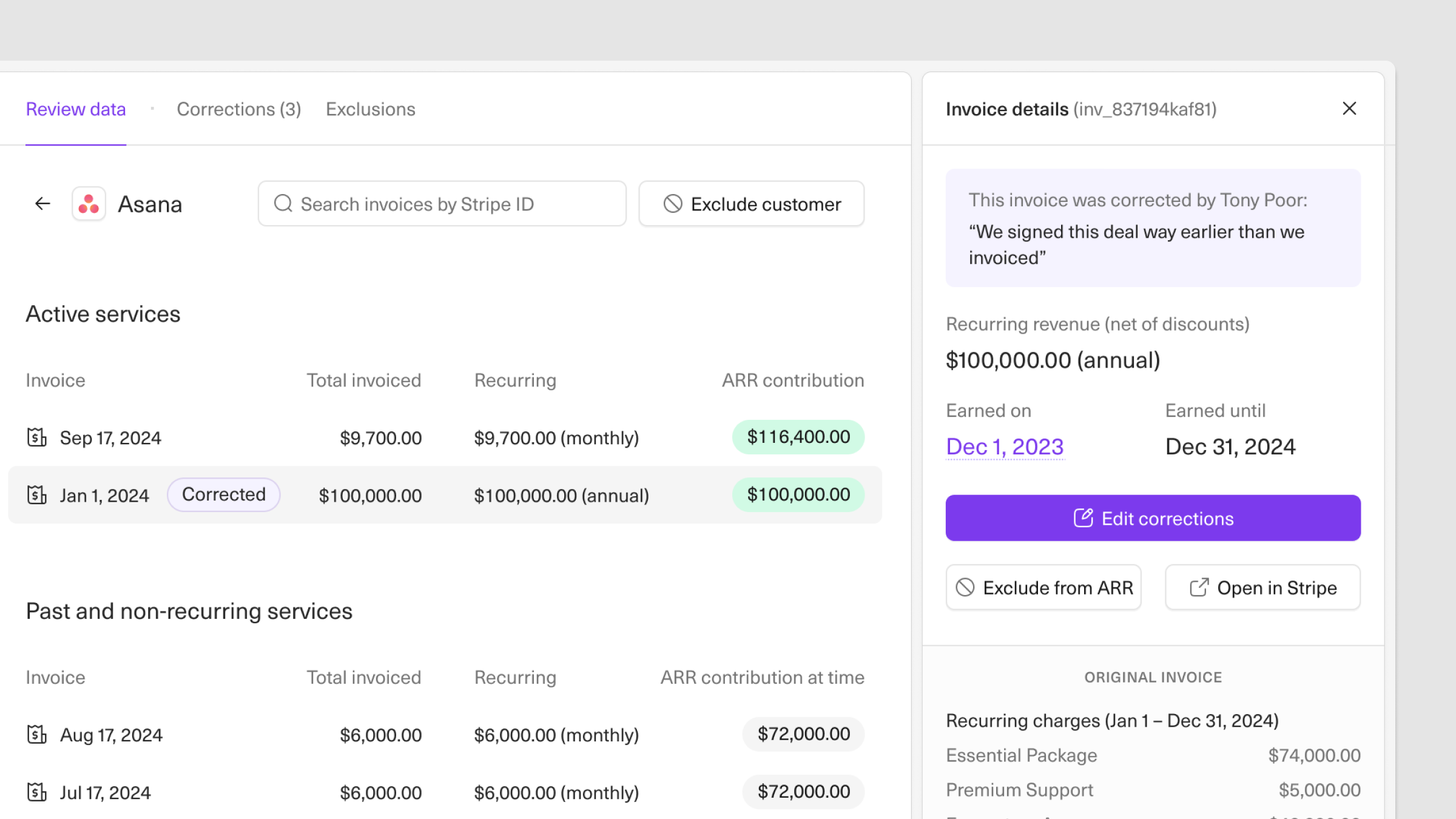 While your ARR Build configuration settings will cover most cases of recognizing revenue, you can also make one-off corrections to Stripe invoices as needed. For example, you could adjust revenue recognition dates for a specific invoice to reflect when a deal was signed versus when the customer was invoiced. You can view and edit all corrections made to date from theData corrections tab of your ARR Build. Corrections override the underlying Stripe data, which will be reflected in the ARR Build views.