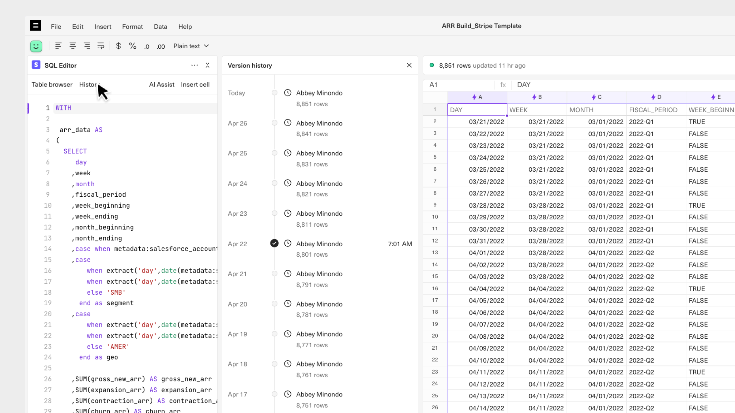 Historybutton on the top-left side of the editor. - Select a previous version of the query to restore.