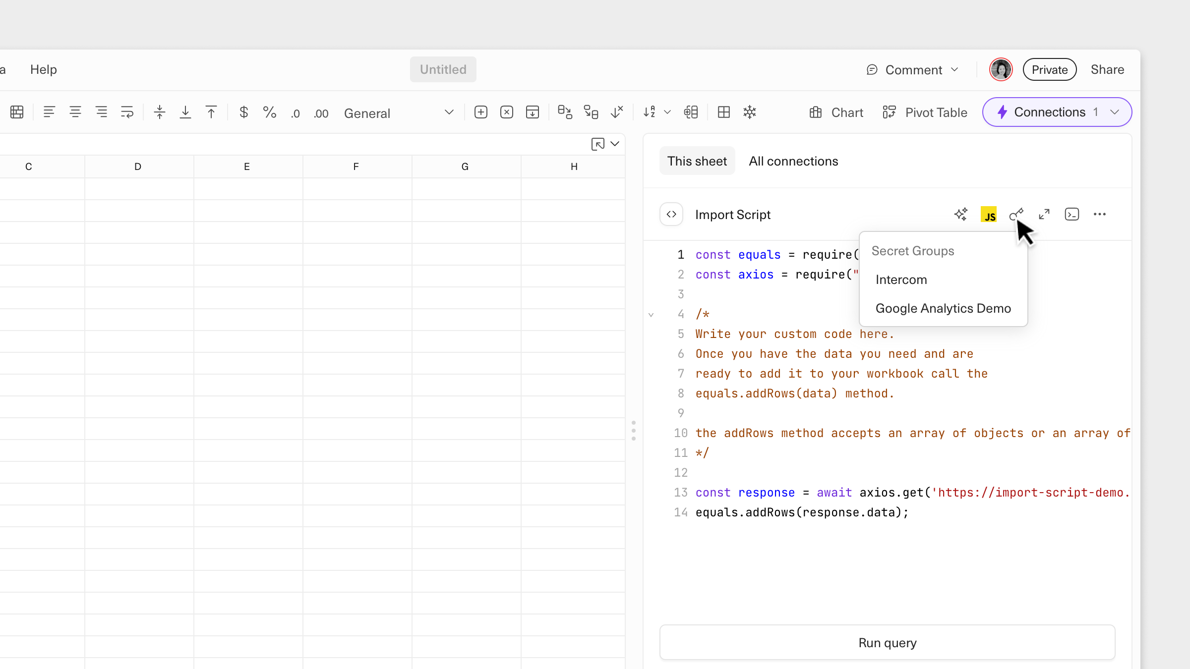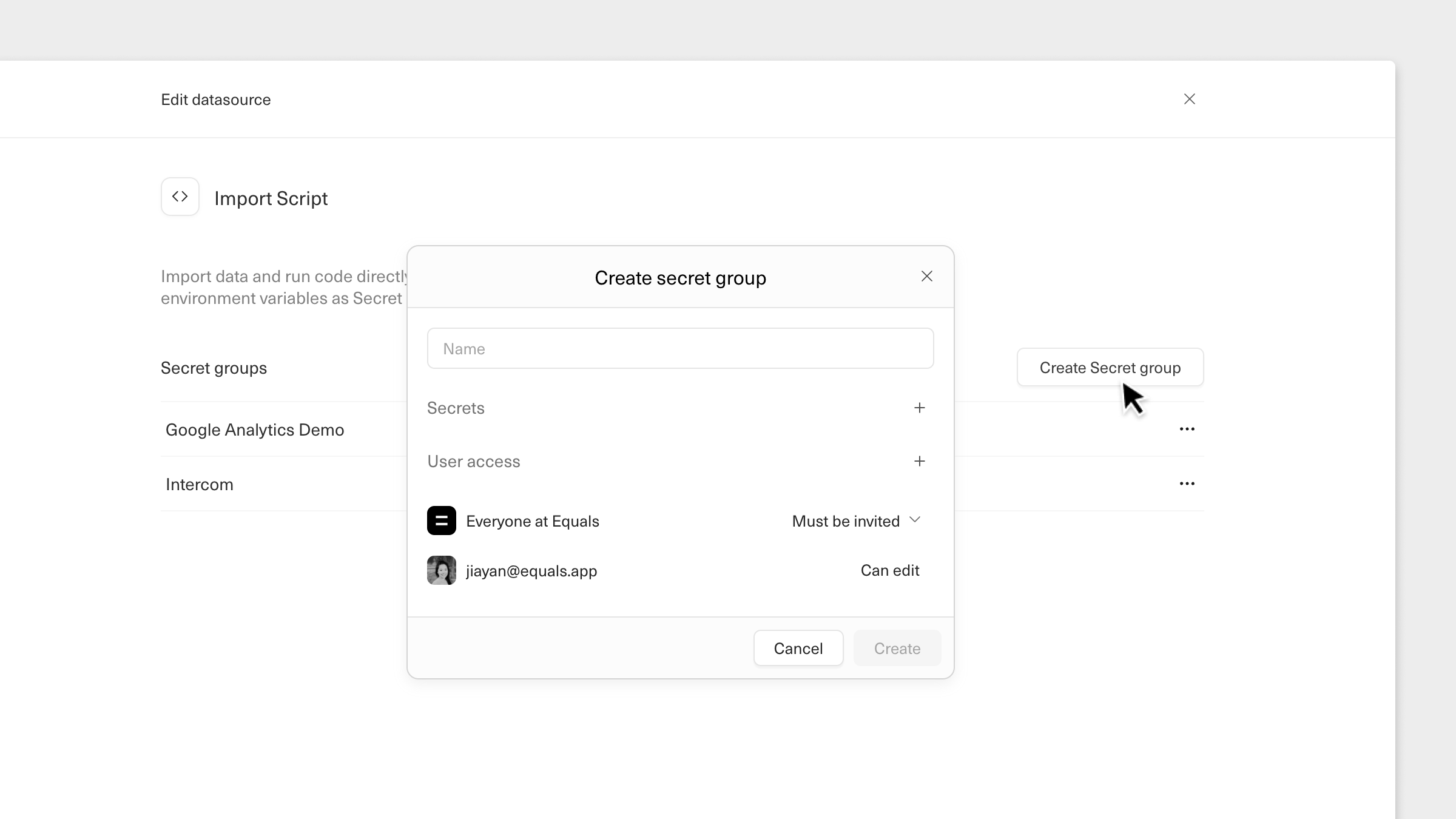 Secrets are only accessible to users with whom they are explicitly shared. Only users with access to all secret groups used in a script are able to run the script.Writing import scripts Examples