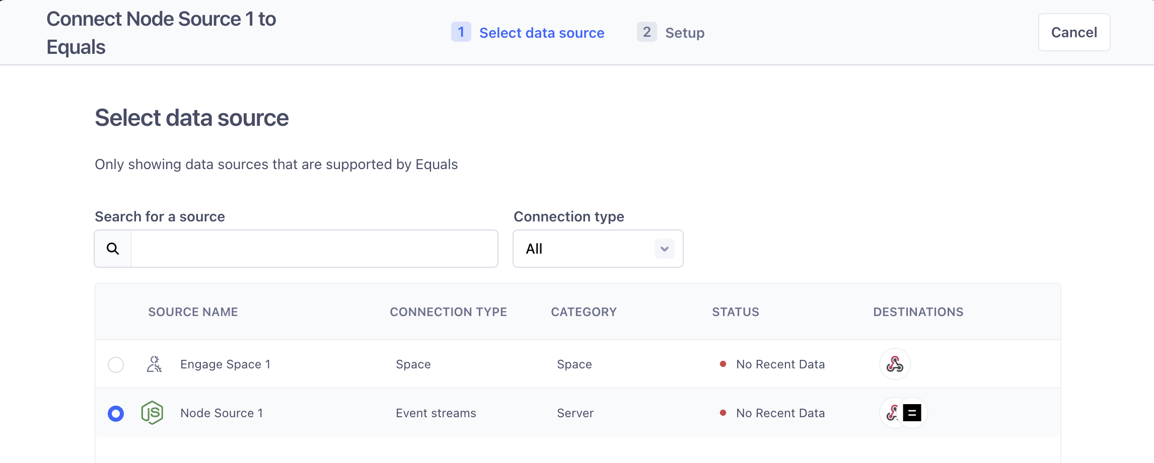 Select the data source that will send data to Equals and give this destination a name.
