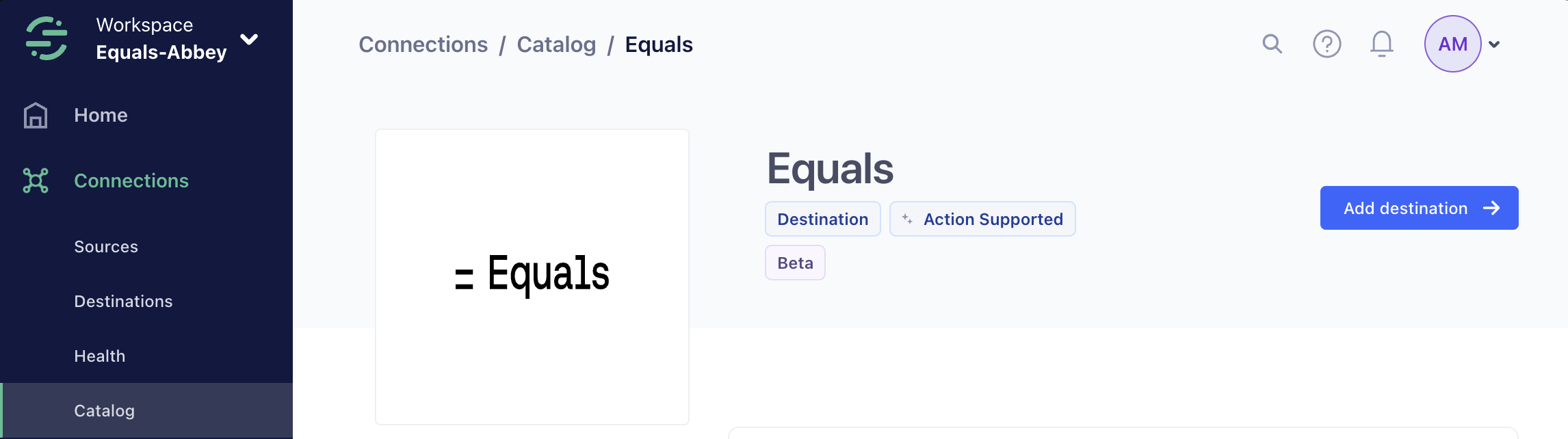 Search for Equals in the Destinations Catalog, and select the destination.