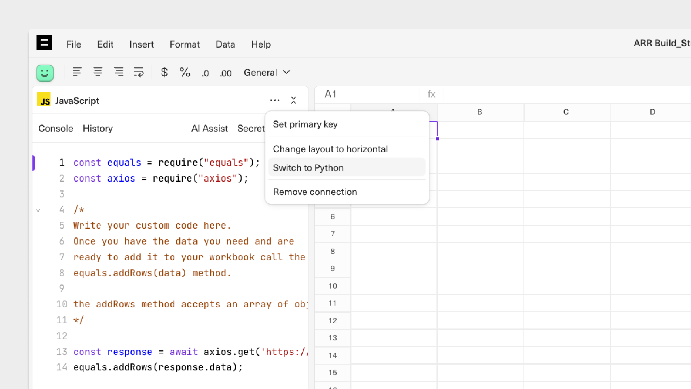 We currently have two different languages that can be used to build Import Scripts: Javascript (Node 16) and Python (3.9) - you can swap between these for each connected sheet from the upper corner of the editor.